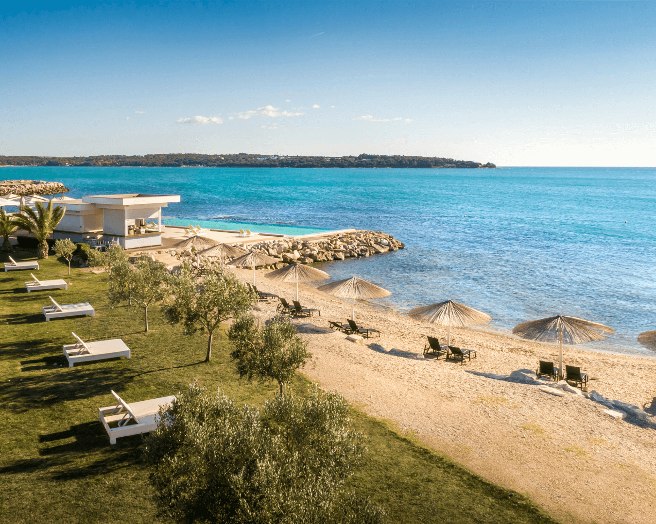 A szálloda előtti sziklás partszakasz gondozott platformokkal és lépcsőkkel biztosítja a vízhez jutást. A víz itt tiszta és gyorsabban mélyül, így úszóknak kifejezetten ideális.
